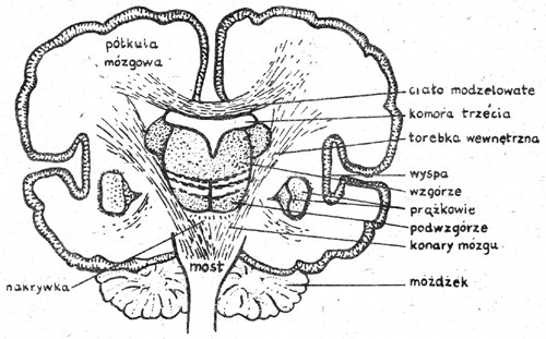 guzowatością potyliczną zewnętrzną u nasady kręgosłupa. (Patrz schemat